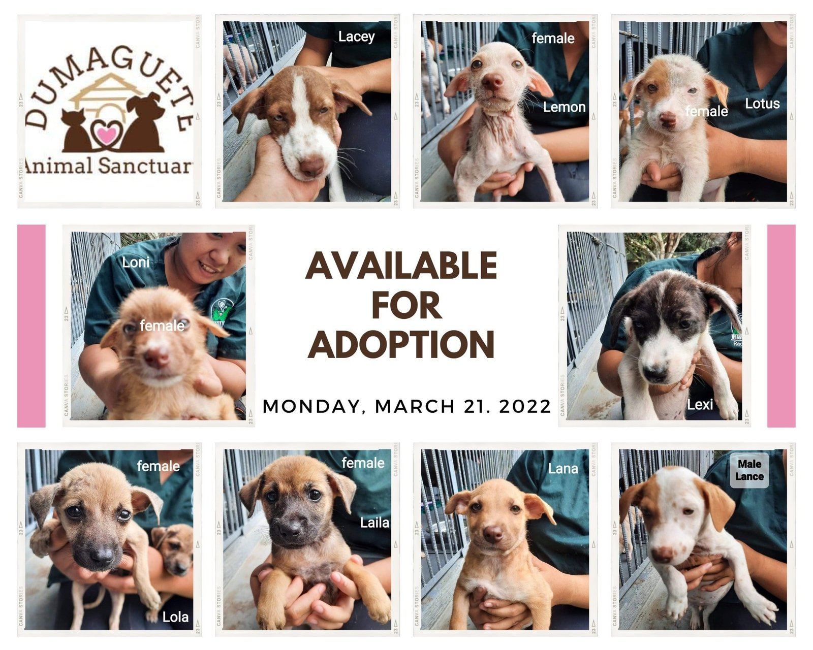 One of four puppies abandoned in March 2022, Lemon was adopted today by Jessa, Erwin, and Angelie. All four pups had Parvovirus, so spent their isolation time away from other dogs until they tested clear. They seem to have no lingering problems, and Lotus, Lacey and Lexi are all waiting their turn! Check out our dogs ready for adoption here.