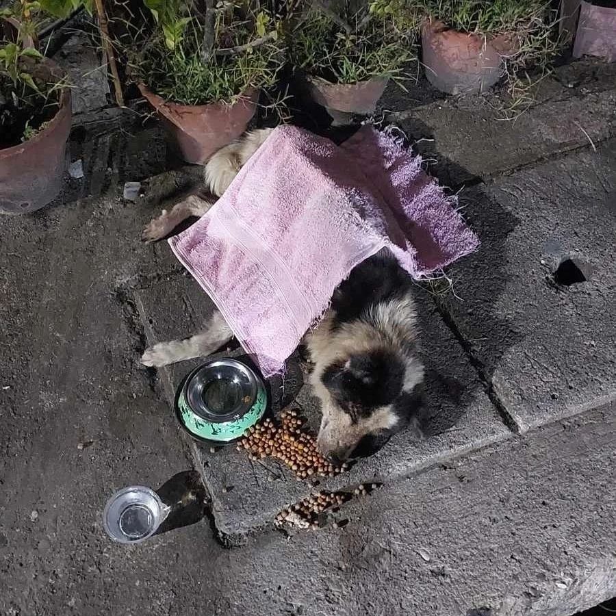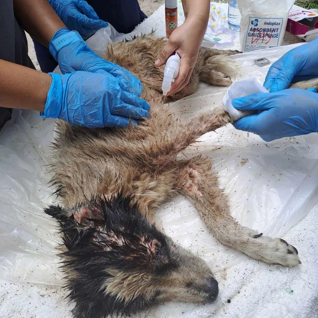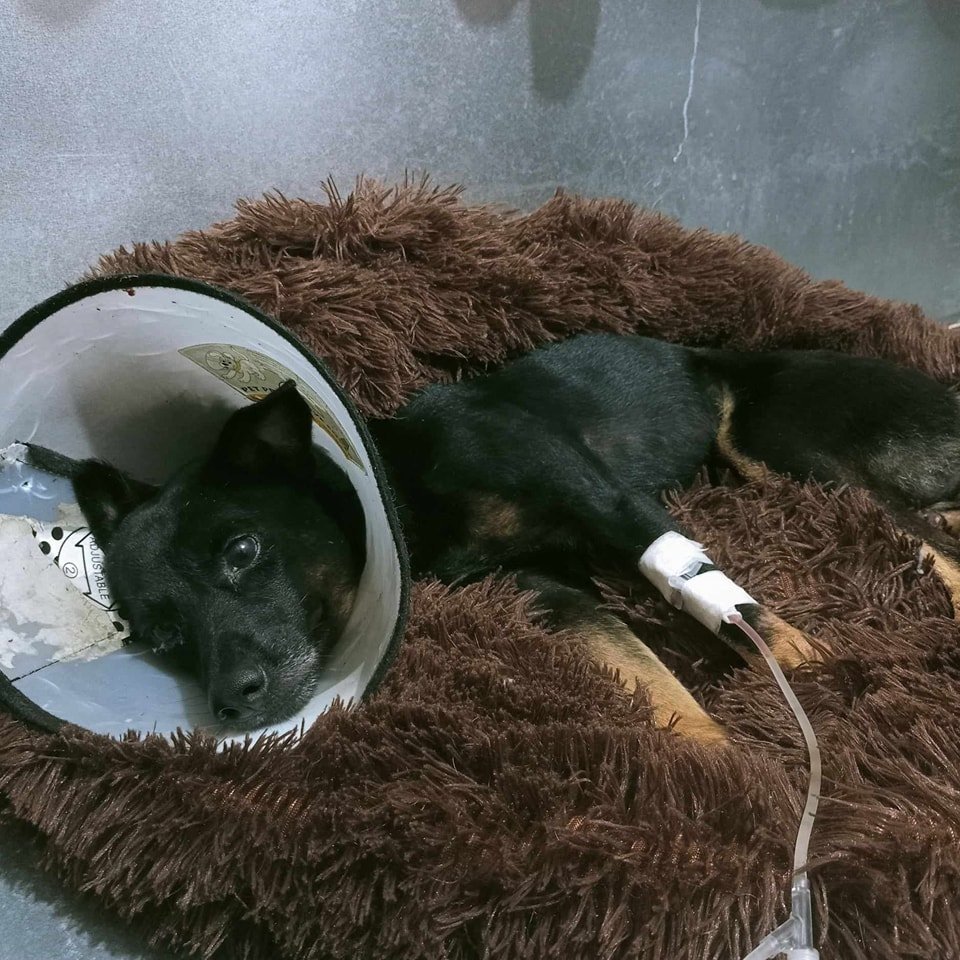 On 18 September 2023 we received a report of another hit and run. He had apparently been lying in this spot since 11pm the previous night. We brought him to the Sanctuary and put him on IV and pain killers, and the following day took him to Animal Wellness for x-rays only to discover his spine was completely severed.