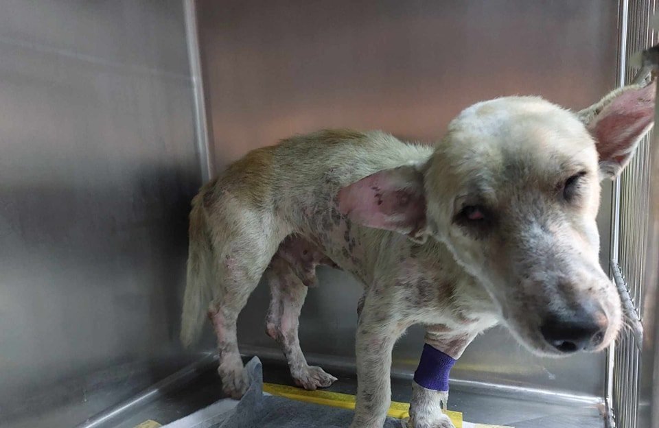 We are currently only rescuing the most critical of cases due to very few donations coming in because of PayPal account issues, and Distemper still at the Sanctuary. However, we just cannot leave dogs dying slow painful deaths. On 4 August 2023 we had a report of a dog that seemed to be the victim of a hit and run. He was also very emaciated, and we named him Steel.