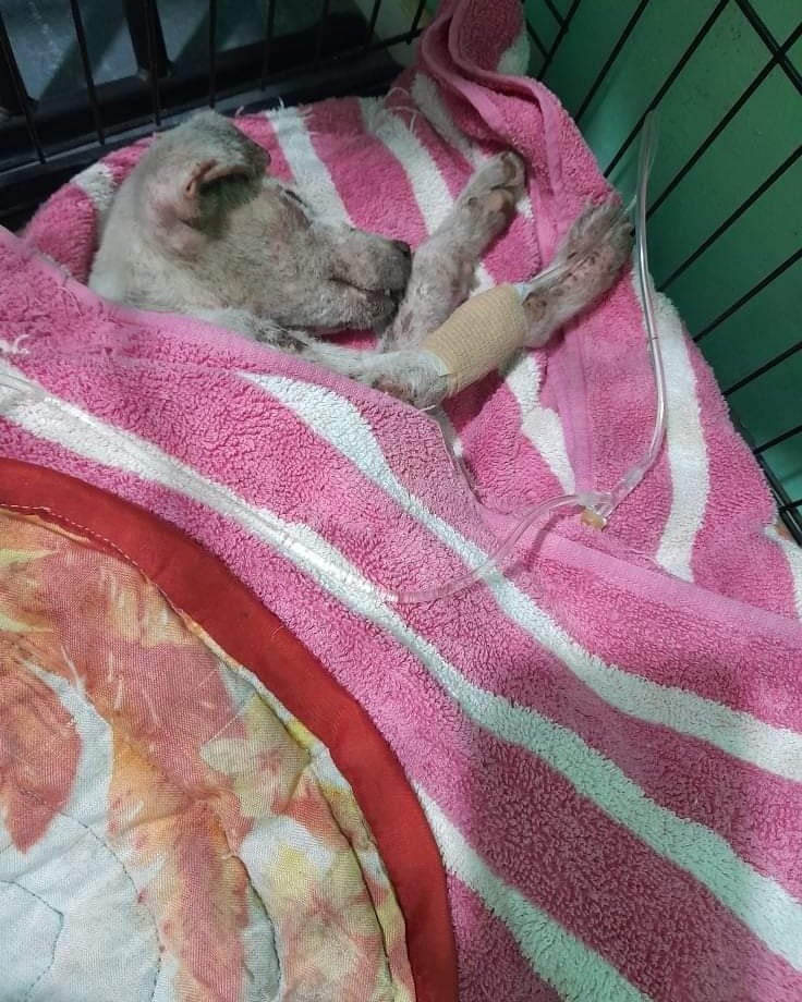 We called her Eva which means Life, and tested her for Distemper and Parvo and with the help of many donations received, did everything we could. She was in a critical condition and her temperature was really low - 34.3, so we put her on heat pads, an IV, gave her pain meds and antibiotics, and had two vet assistants, Carl and Adrian, to monitor her through the nights. They stayed with her, stroking her and talking to her so she didn't feel alone.