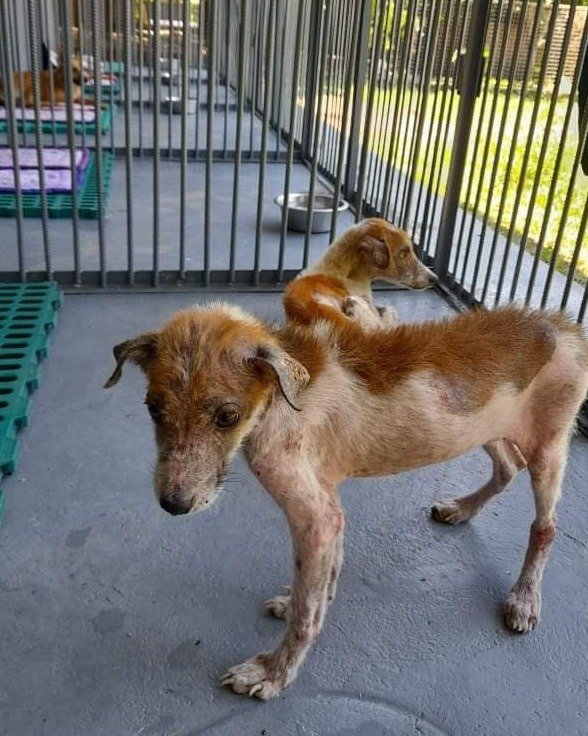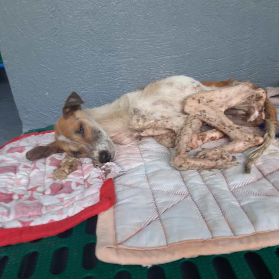 On July 29 2021, we rescued a young female dog and her puppy from extreme neglect. She and the puppy were tied up with no food, shelter or water, and must have been like that for a long time. The owner signed them over to us.