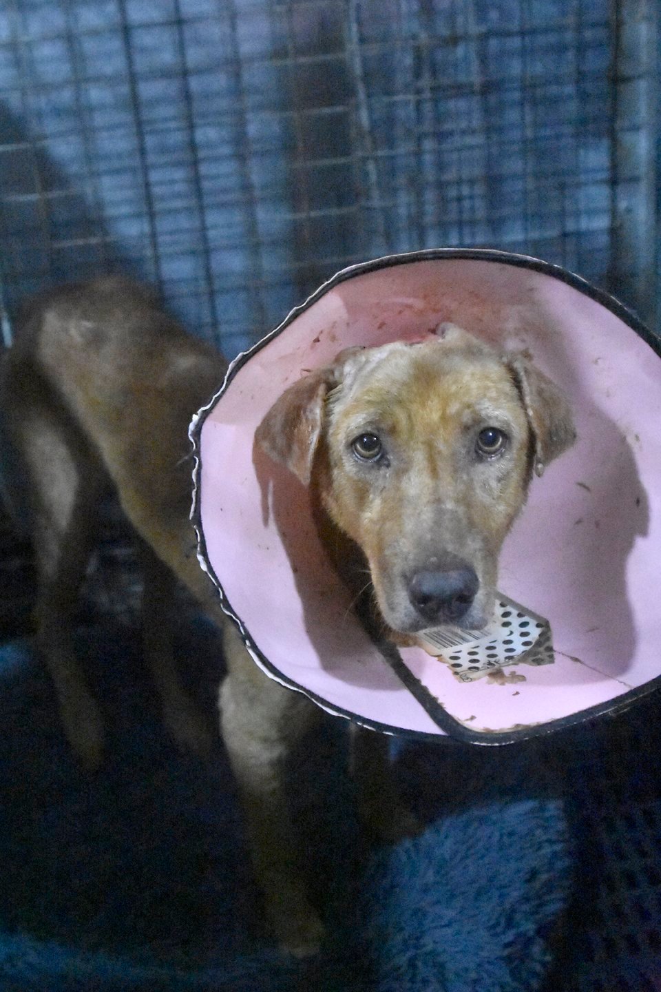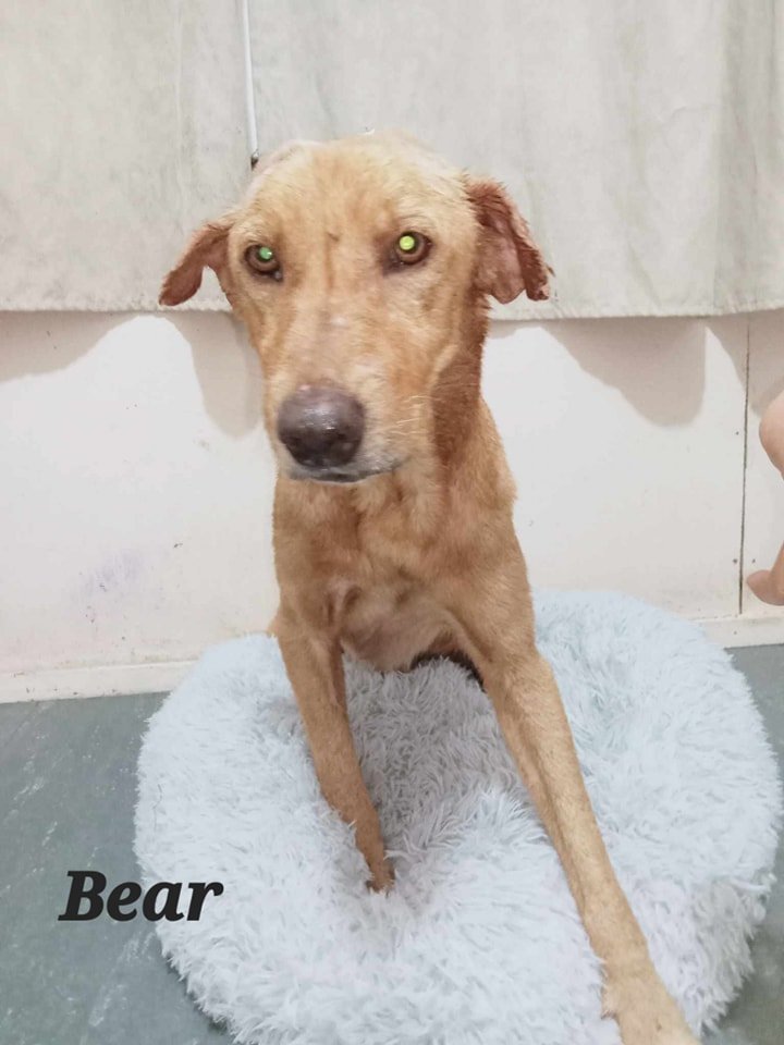 In August 2023, we took in older dog with a large head wound that looked much like Teo's when he was rescued.  The wound is treatable, so we're hoping we can get him well again and into a new home as soon as he is healed.  We called him Bear.