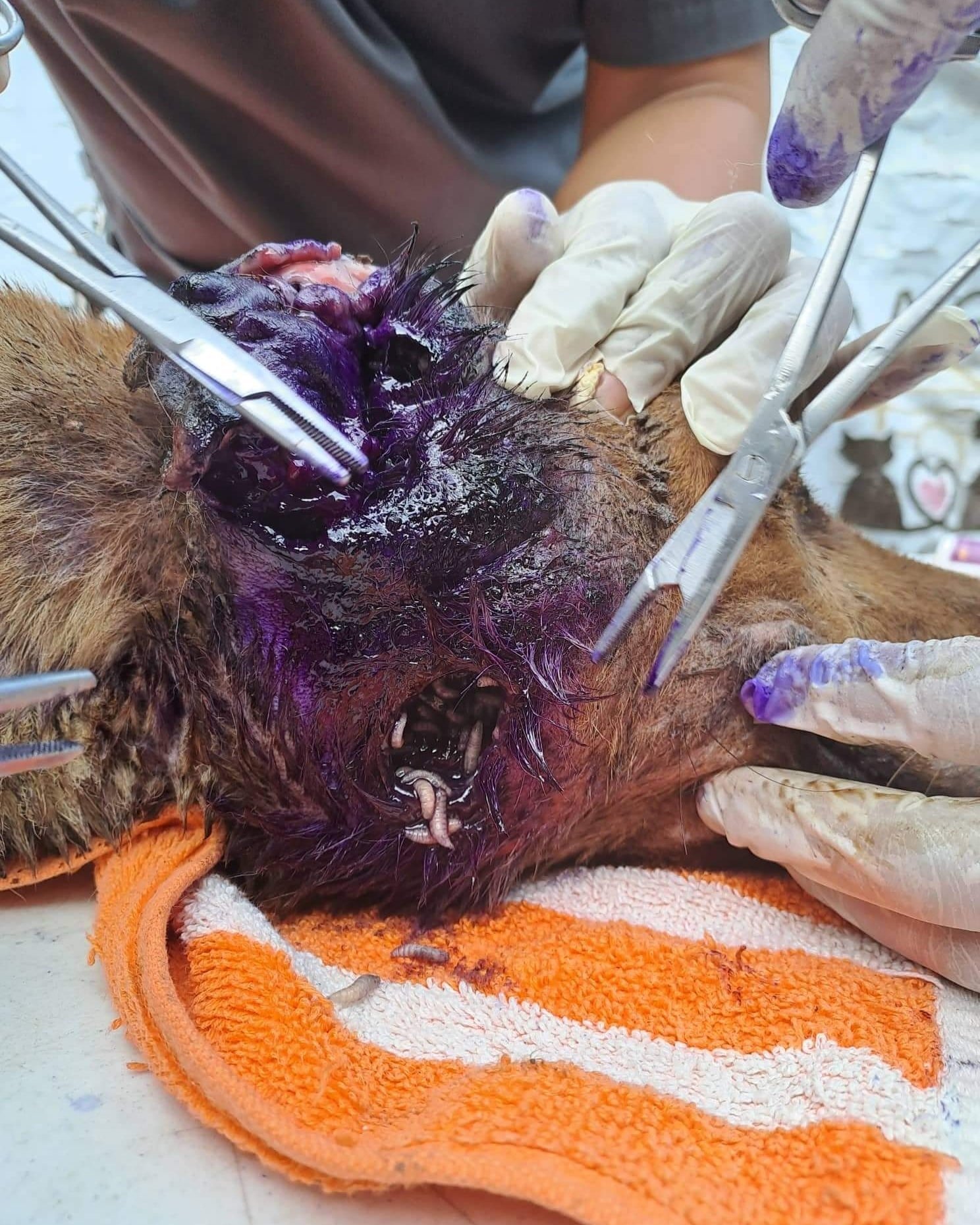 Whatever caused the wound on his neck is unclear, but infection had set in, with maggots openly crawling around inside.
