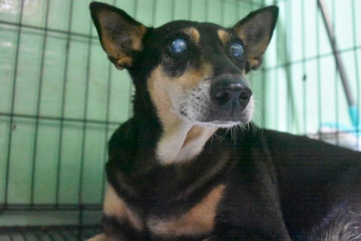 On 15 September 2022, we received reports of a poor blind older dog that was seen hit by a car. People in the area tied her to a gate so she wouldn't wander into the road again and left her food and water. We put out an appeal to find her owner but no one stepped up, and then it began to rain heavily.