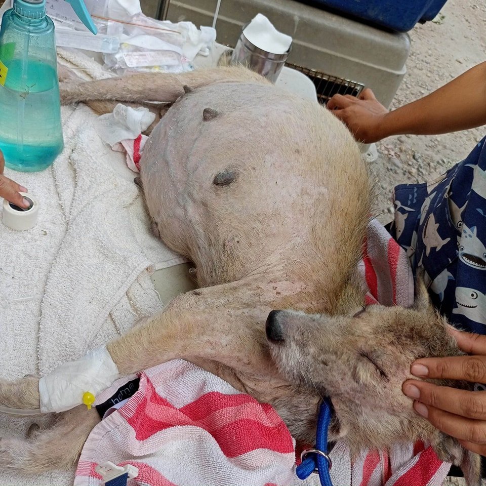 In April 2023 we got a report of a older stray dog being fed by a local community who had given birth, but her puppies didn't survive and she her abdomen had become extremely swollen. Many donations large and small made it possible for us to bring her in and treat her, and we hope she is now on the road to recovery.