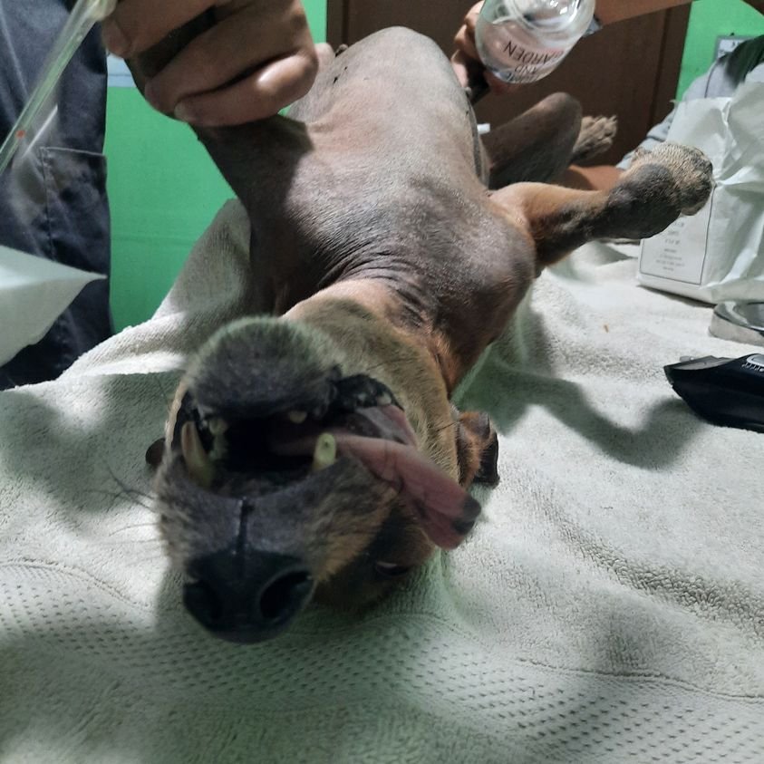 He had a severe case of Mange, a maggot-infected ear, totally dehydrated and emaciated and also has Anaplasma.  His CBC test showed high white blood cells indicating infection / inflammation. His red blood cells are low - showing Anemia.  Doc Pierre kindly gave instruction to our assistants whilst on vacation, and they began their work.