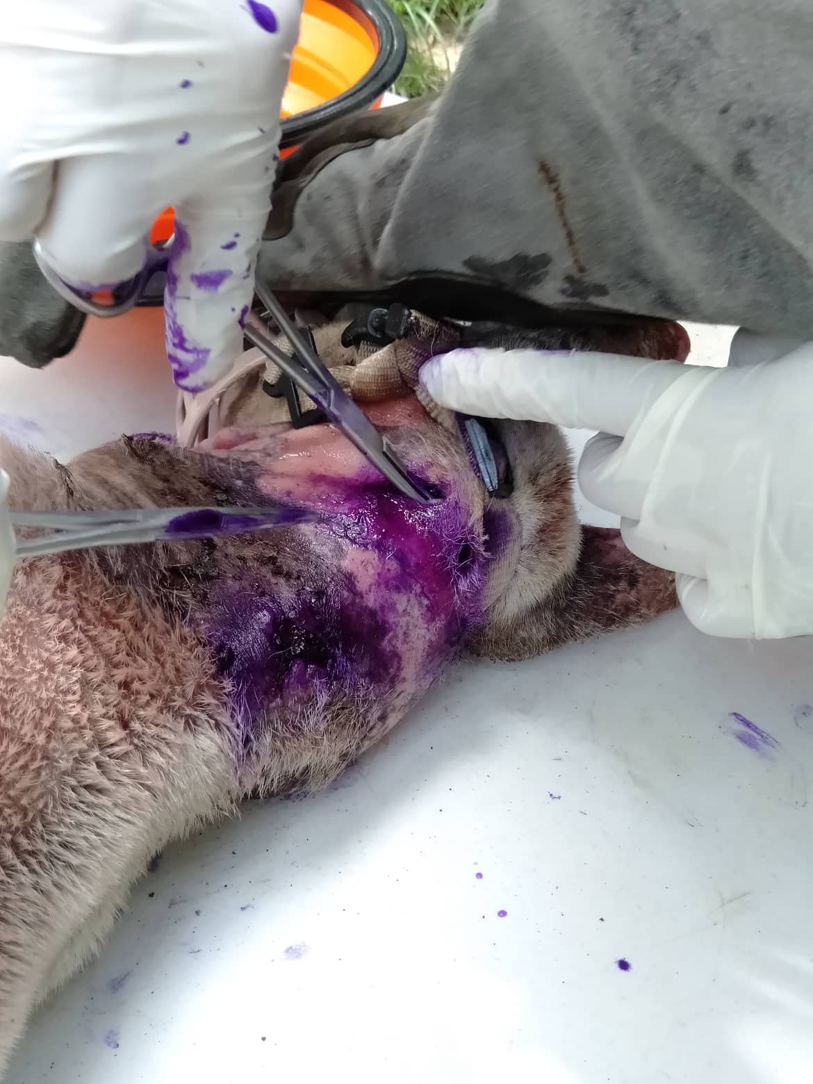 Kane had a broken leg, severe Mange, he was clearly on the edge of starvation, and his collar was embedded int his neck.  His flesh was rotten and maggot-infested where the collar had bitten in.  We removed it, and bought him to the Sanctuary.  Instagram followers named him Kane, which is the Welsh name for a warrior.