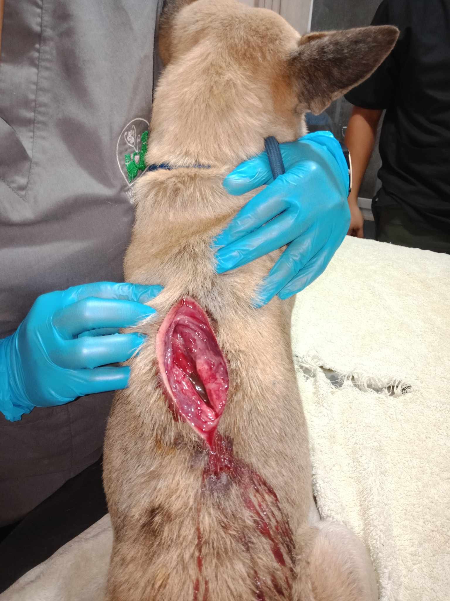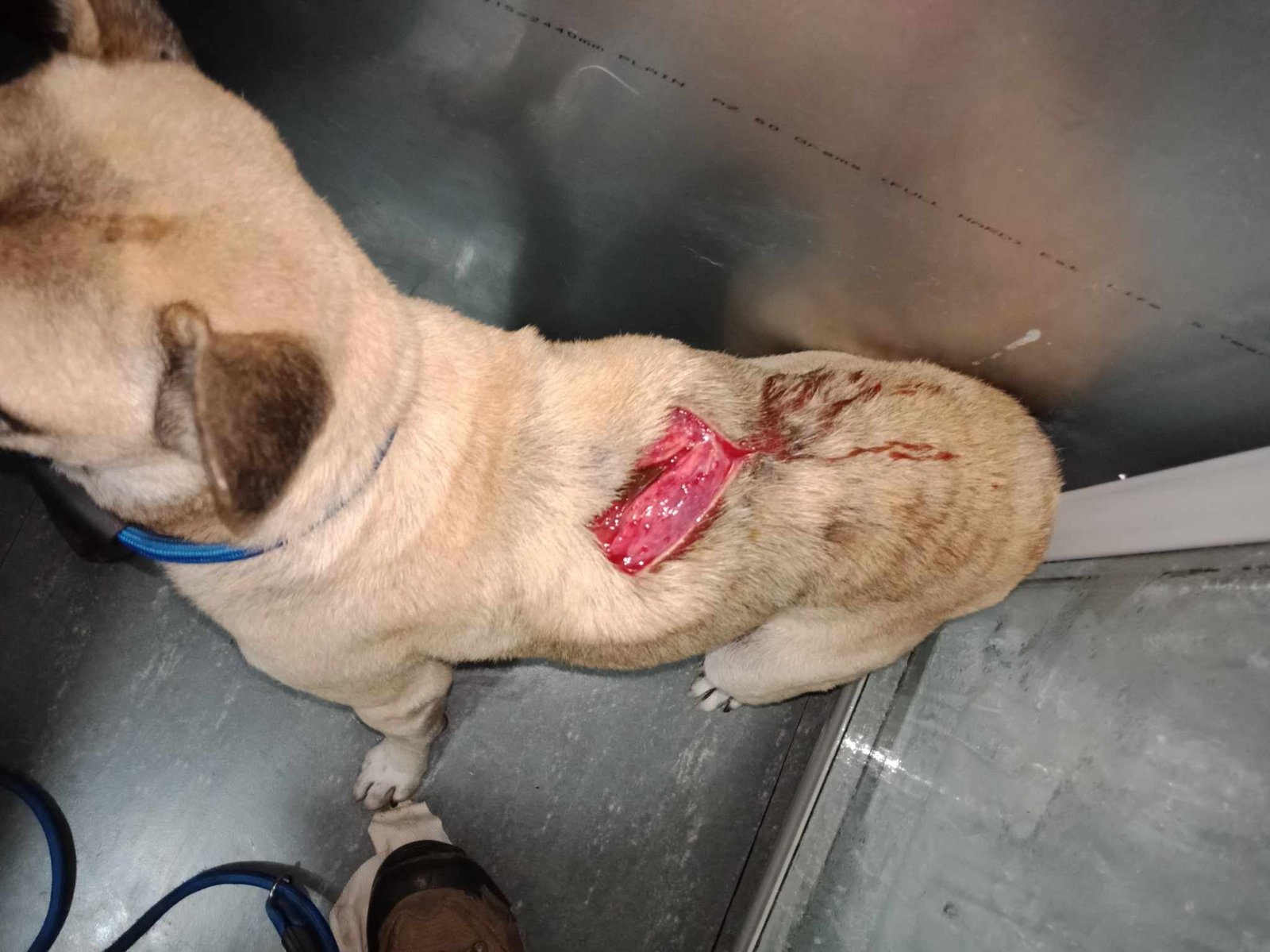 On 14 October 2023, we received reports of a dog with a severe cut on his back.  He was known to hang around near some fish stalls, and in all likelihood received the injury from an irate stall holder whose temper snapped and lashed out at him with a knife.  We of course have no proof of this, but the cut is so clean, it can only have been caused by a blade.