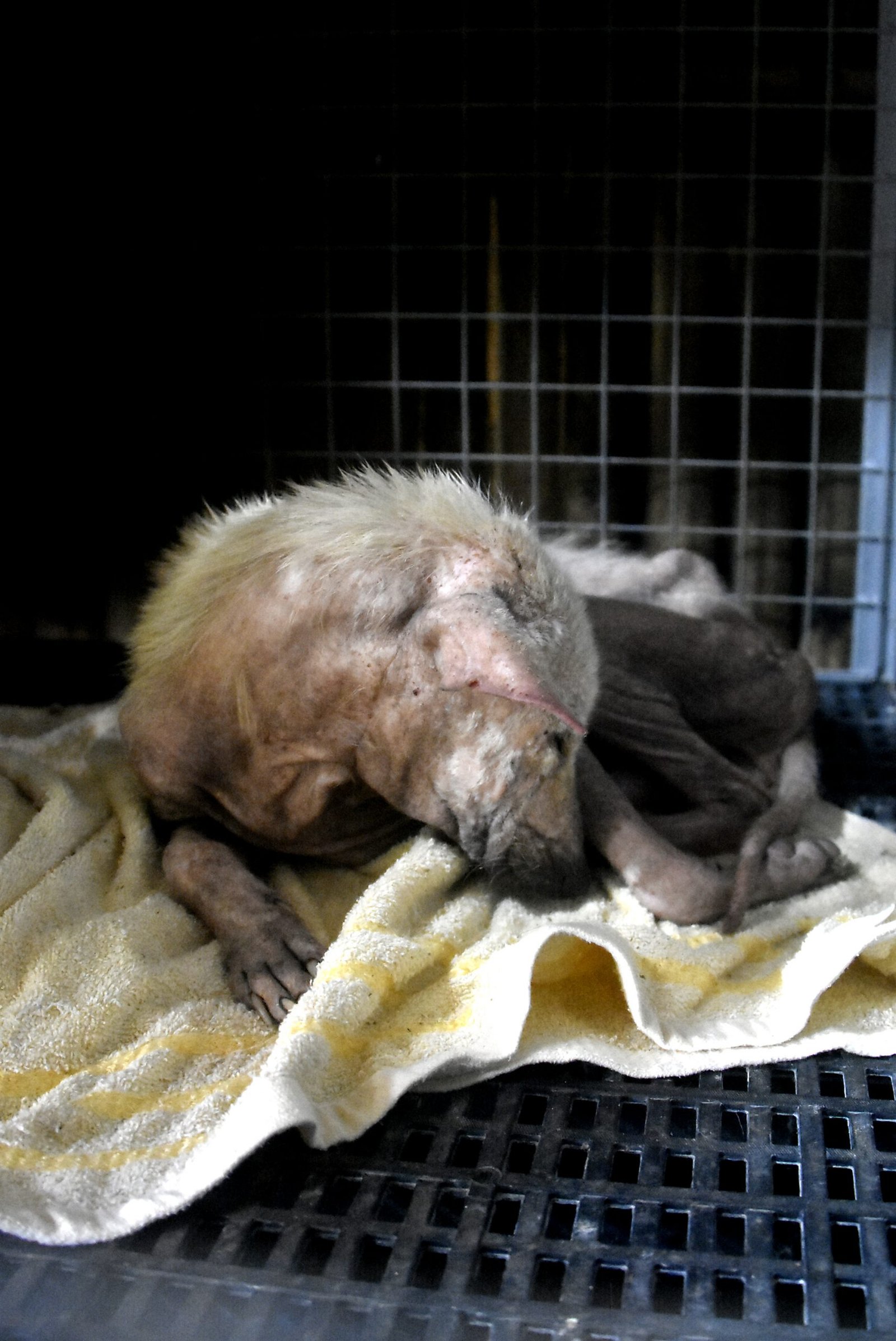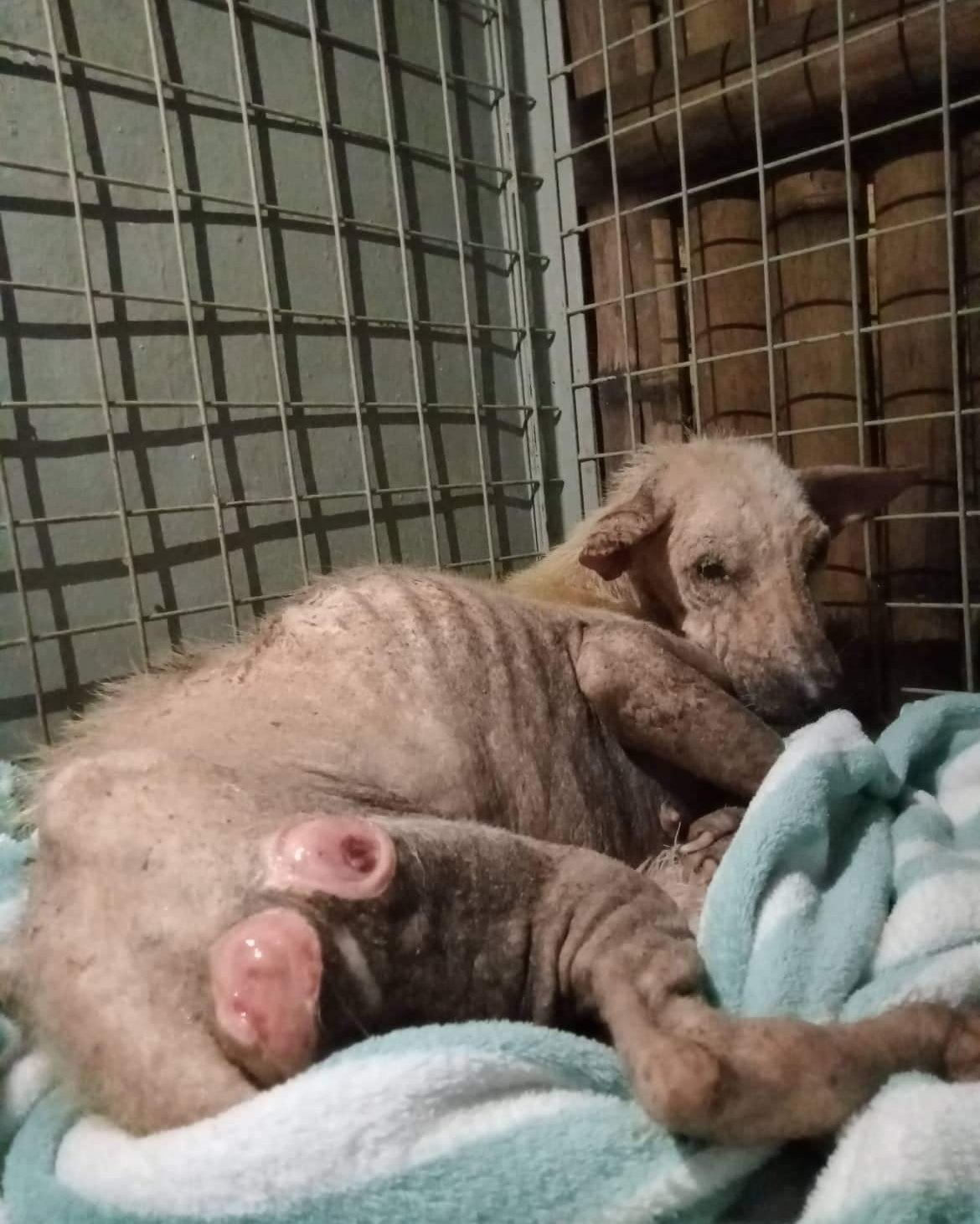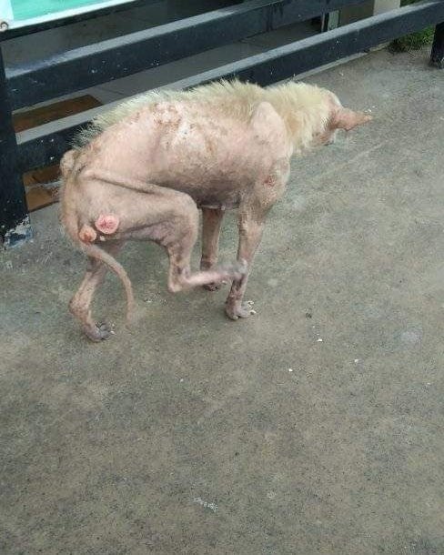 On 8 August 2022, a DAS supporter Hannah reported a very thin, hairless and petrified dog, and as we had nobody available to collect her, yet more good friends of DAS went and collected her - Henrik and Dong. She had bad sores on her hind quarters, almost no hair, and was starving. Her blood tests were not good, she was very anaemic and had a high infection.