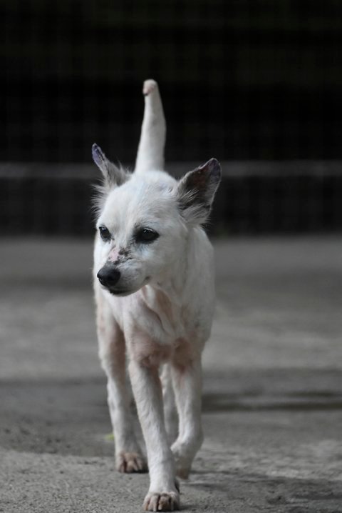 Joy was understandably very frightened by her ordeal, and hid at the back of her cage for the longest time, but little by little our staff won her over. Her Mange was quite severe, but she is rapidly regaining the fluffiest, whitest coat imaginable. When she's back to her full health, she'll be quite the fluff-ball!