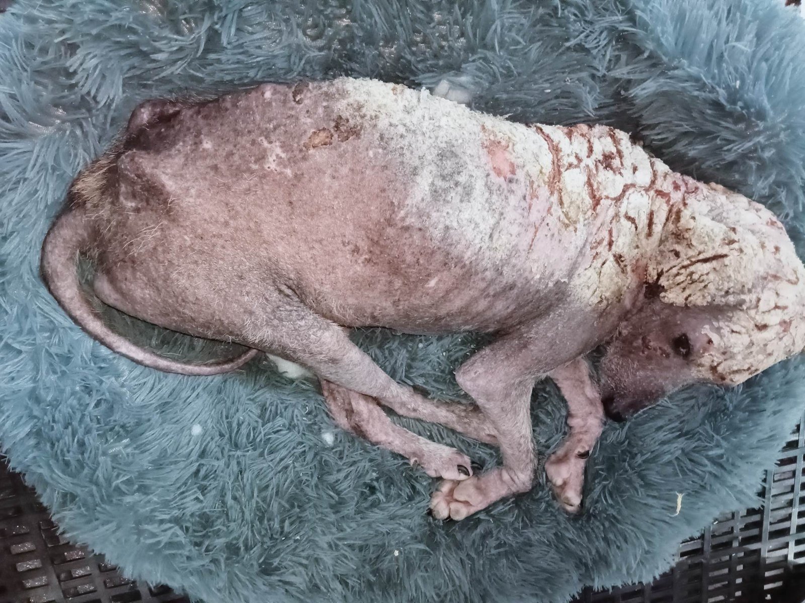 Murphy's mange was particularly bad, and he would not have lasted much longer without help.  He also tested positive for distemper but the line on the test was faint which indicates a low viral load. We brought him into the Sanctuary as with a positive distemper test, he can't go anywhere else.