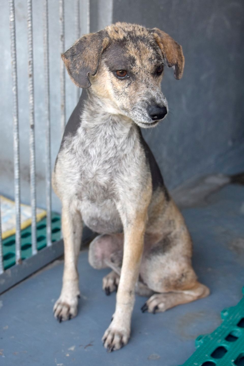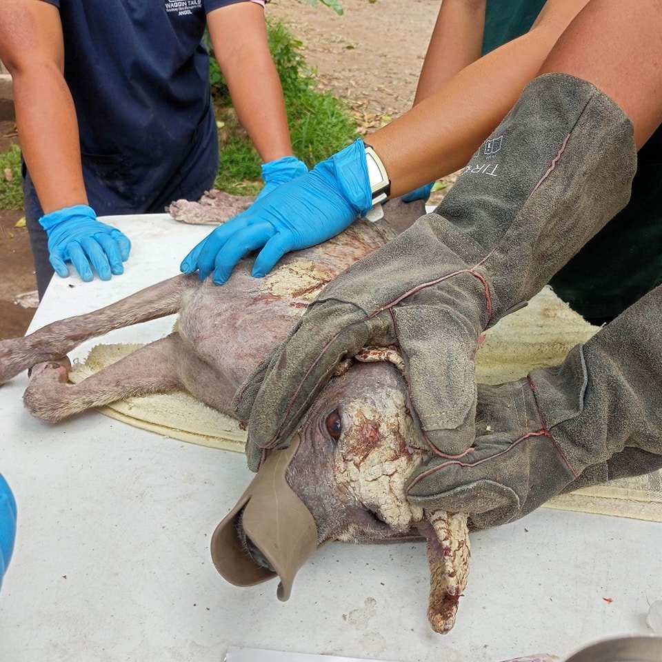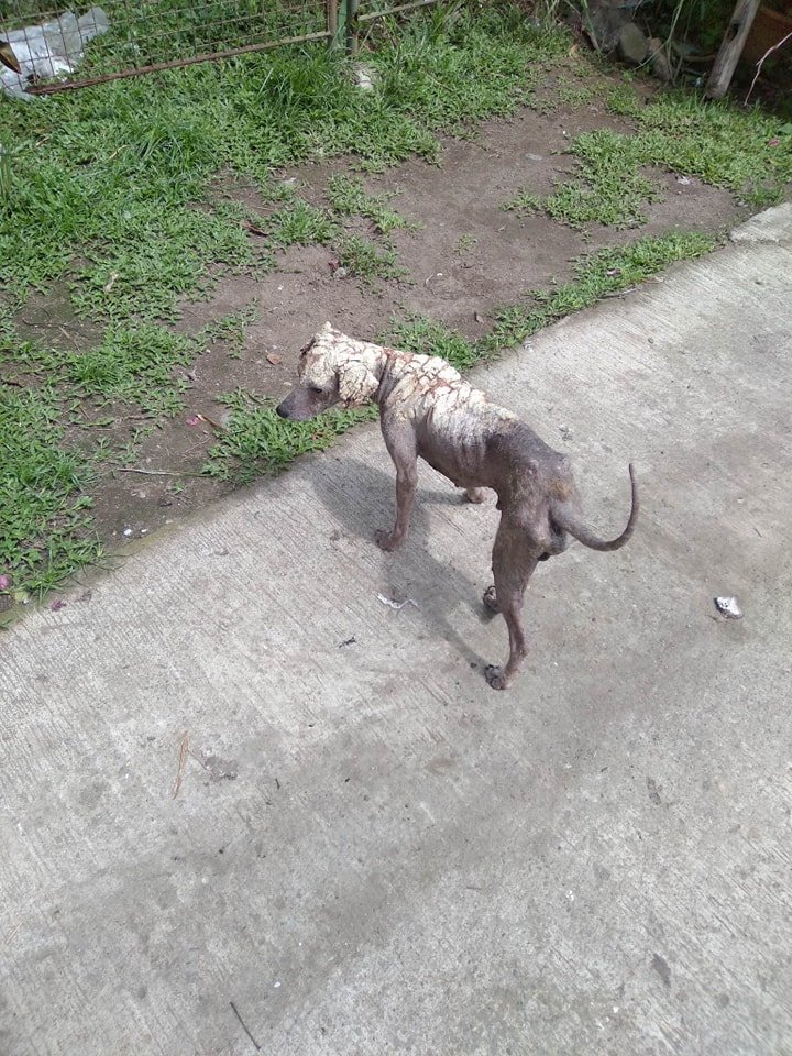 In June 2023, we were called to rescue a desperately ill dog at Valencia's dump.  Sadly, we were too late, but just in time for two others - a boy with bad Mange, Murphy, and a girl with terribly distended belly, Astra.  He has a case of severe Mange and was very close to suffering the same fate as the dog that died just as we were about to rescue him.